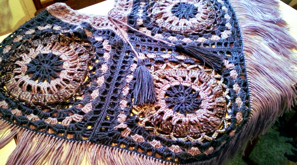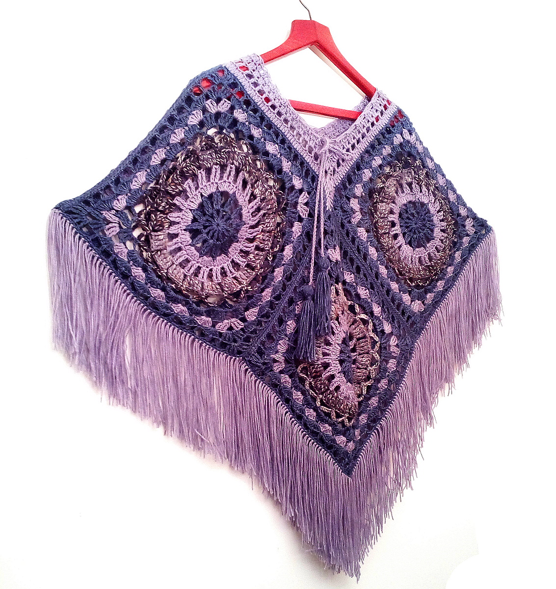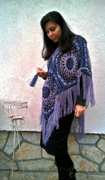 This poncho consists of 4 or 6 large square motifs, which depends on the size. It is decorated with fringe and two tassels at the ends of the drawstring. The yarn used for the blue and pink poncho is a selection of 4 colors, while the dim brown-blue one used up 3 colors of different yarn. Both items are crocheted from blend yarn. Exact amount of yarn is given in the PDF instructions. Yarn used in both models are leftovers of blend fibers.