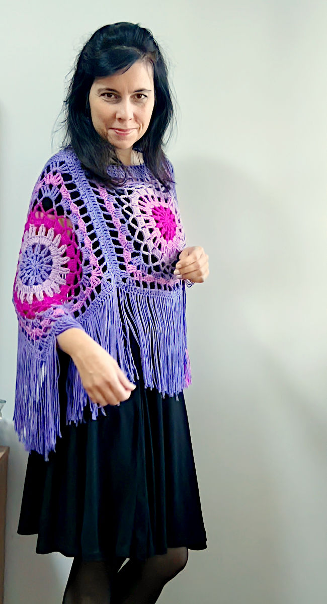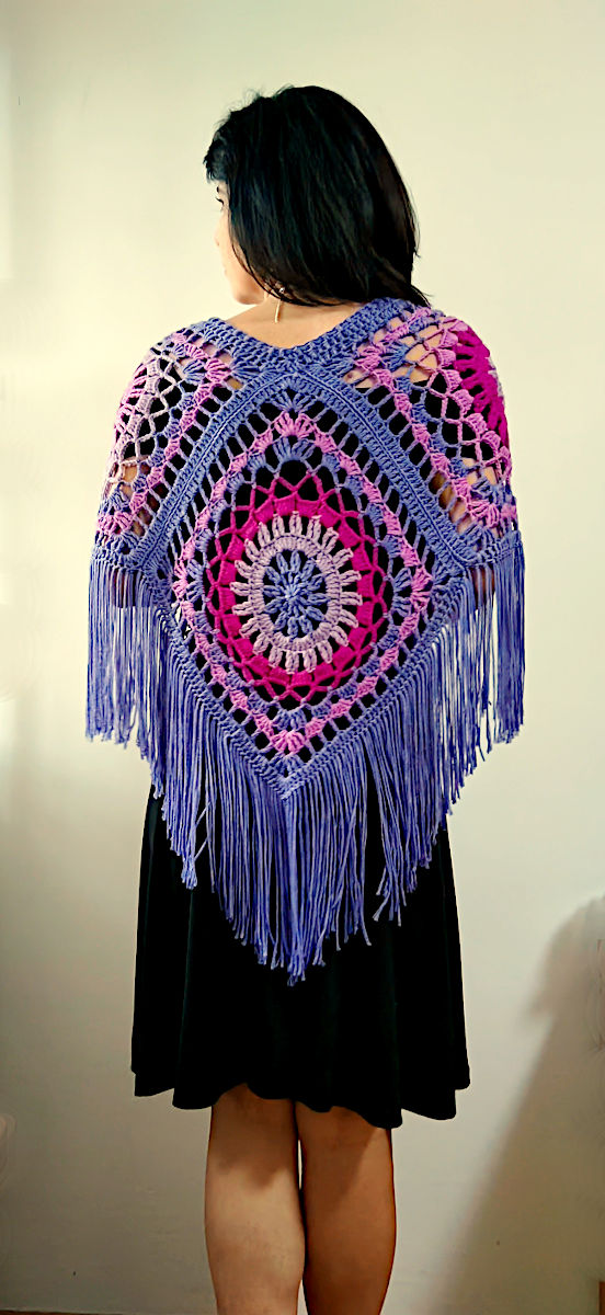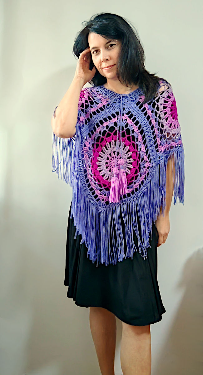 Only 4 square motifs for the poncho, which you can style in 2 different ways. Place the central diagonal motif at the front with the drawstring falling down mid chest. Or, turn the central motif to one shoulder and let the tassels run down your side.