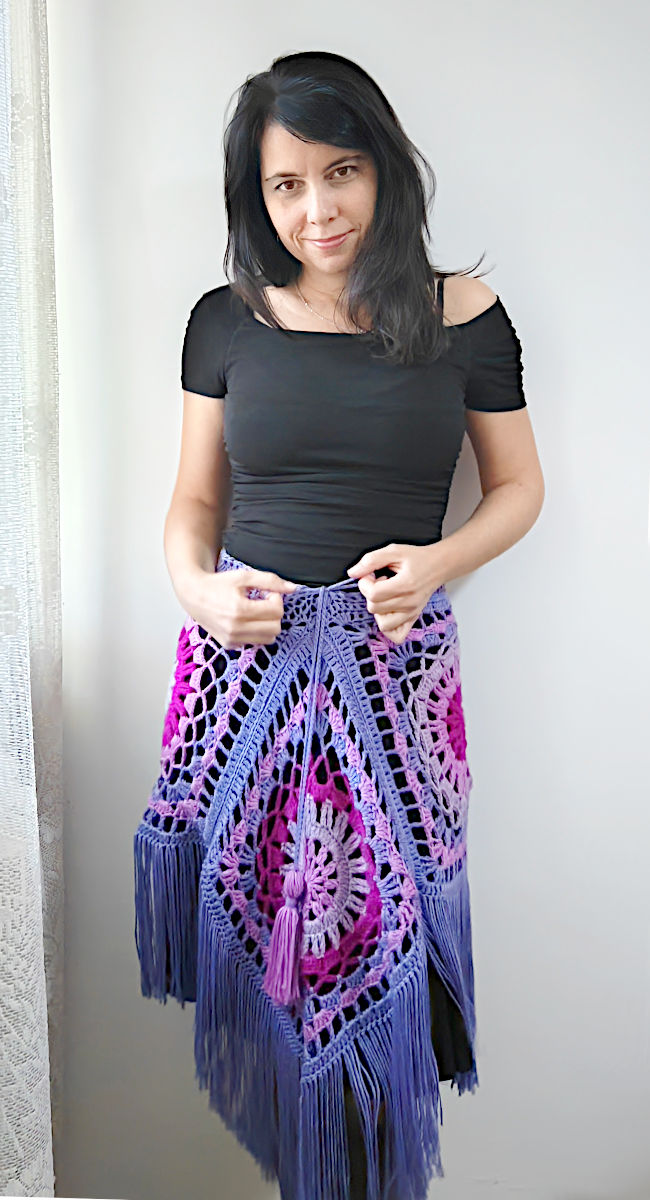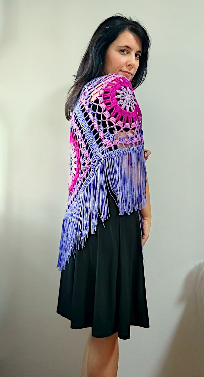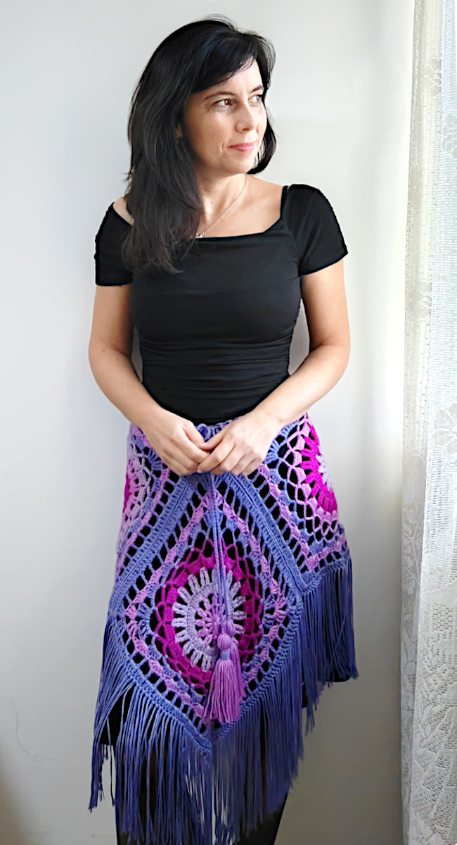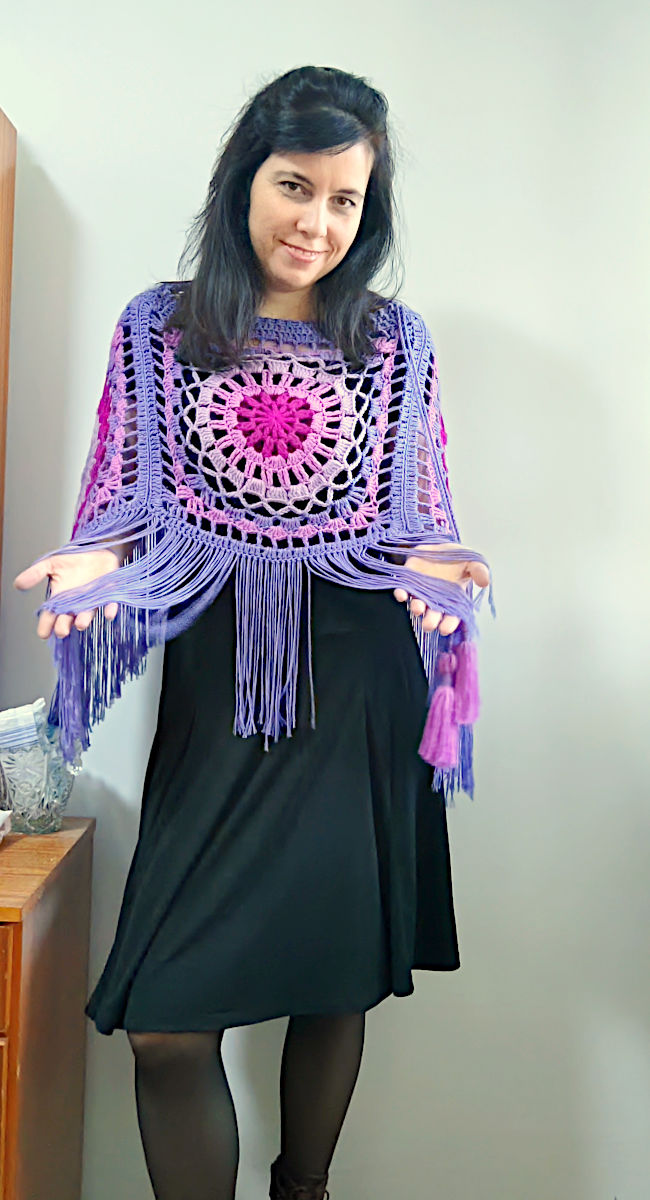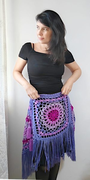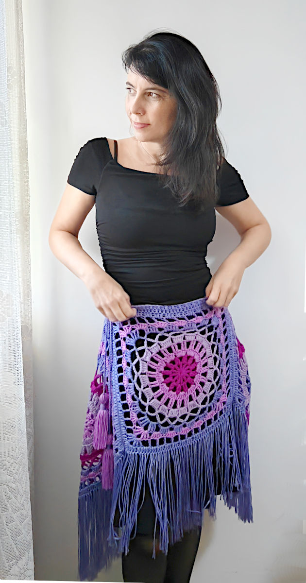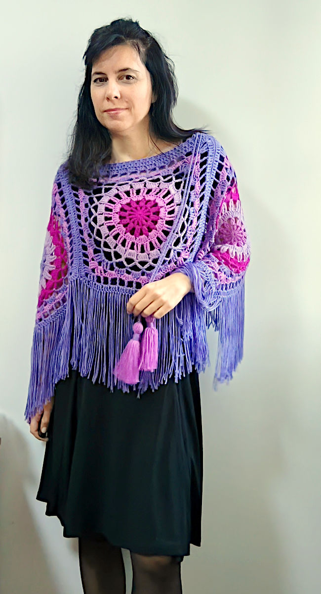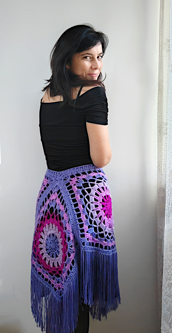 With 6 square motifs you will get a large, wide poncho, suitable for size L/XL. I apologize for the poor quality of images for this size because this piece was made several years ago and is no longer in my possession. I wish I could take new photos of it with a better camera. This 6-piece poncho can also be used as a skirt. Try it out, experiment with colors and different types of yarn, and, most importantly, have fun making it!