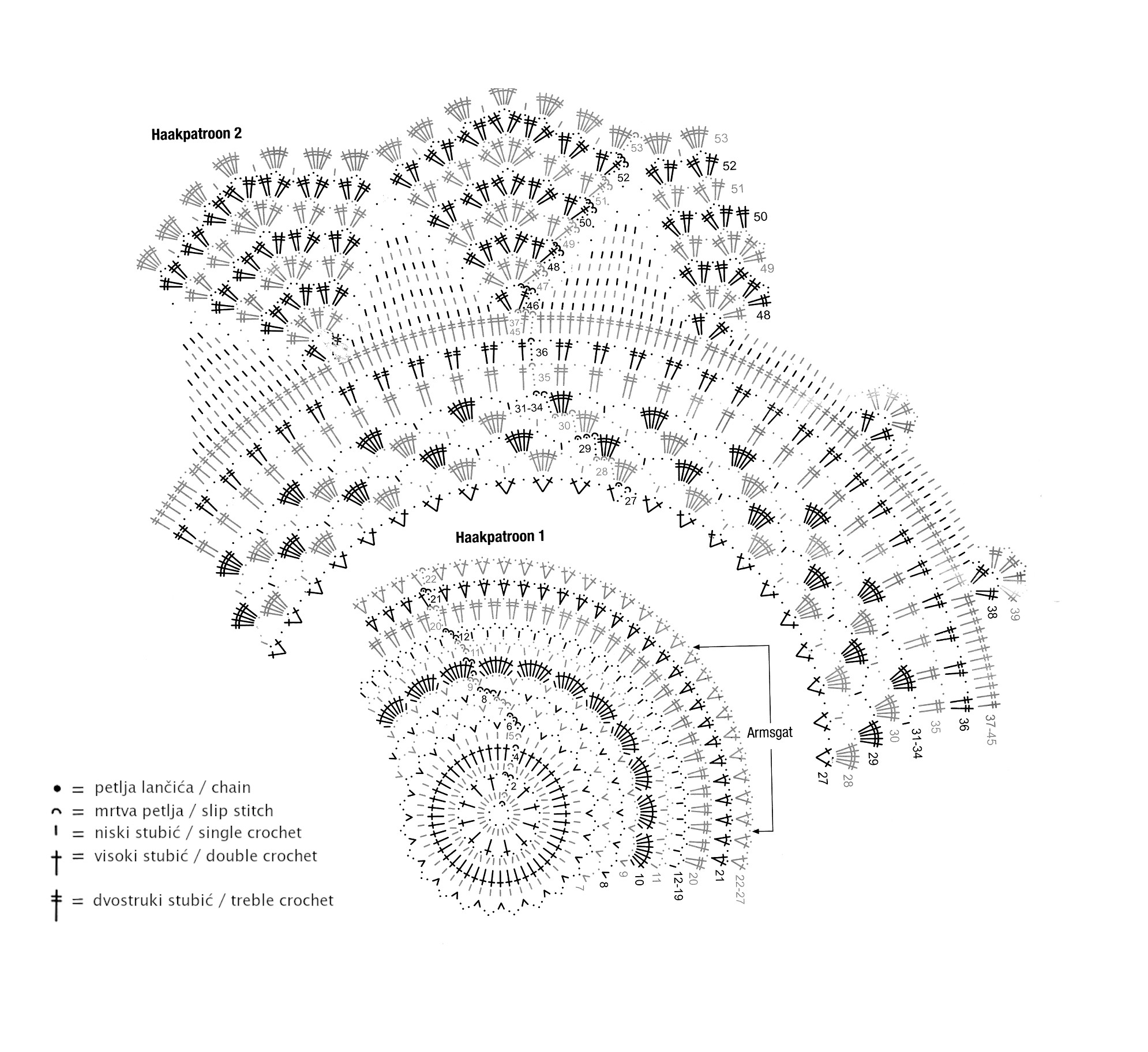 Na šemi otvori za ruke označeni su strelicama i rečju Armsgat u redovima označenim 22-27. U 26. redu na mestima koje pokazuju strelice treba uraditi po 1 niski stubić, a između strelica po 35 petlji lančića za svaki otvor. U narednom redu nastavite onako kako pokazuje šema nad svim petljama kao i nad lančićima od 35 petlji.