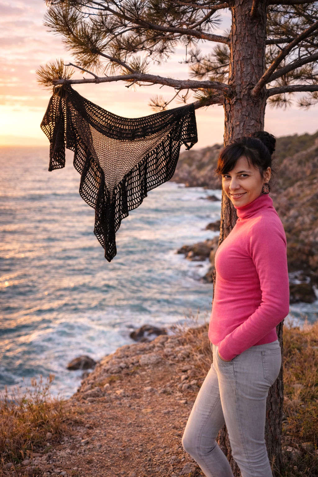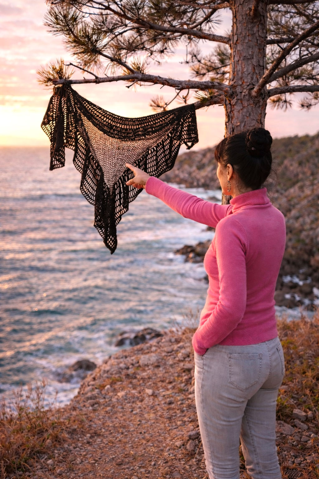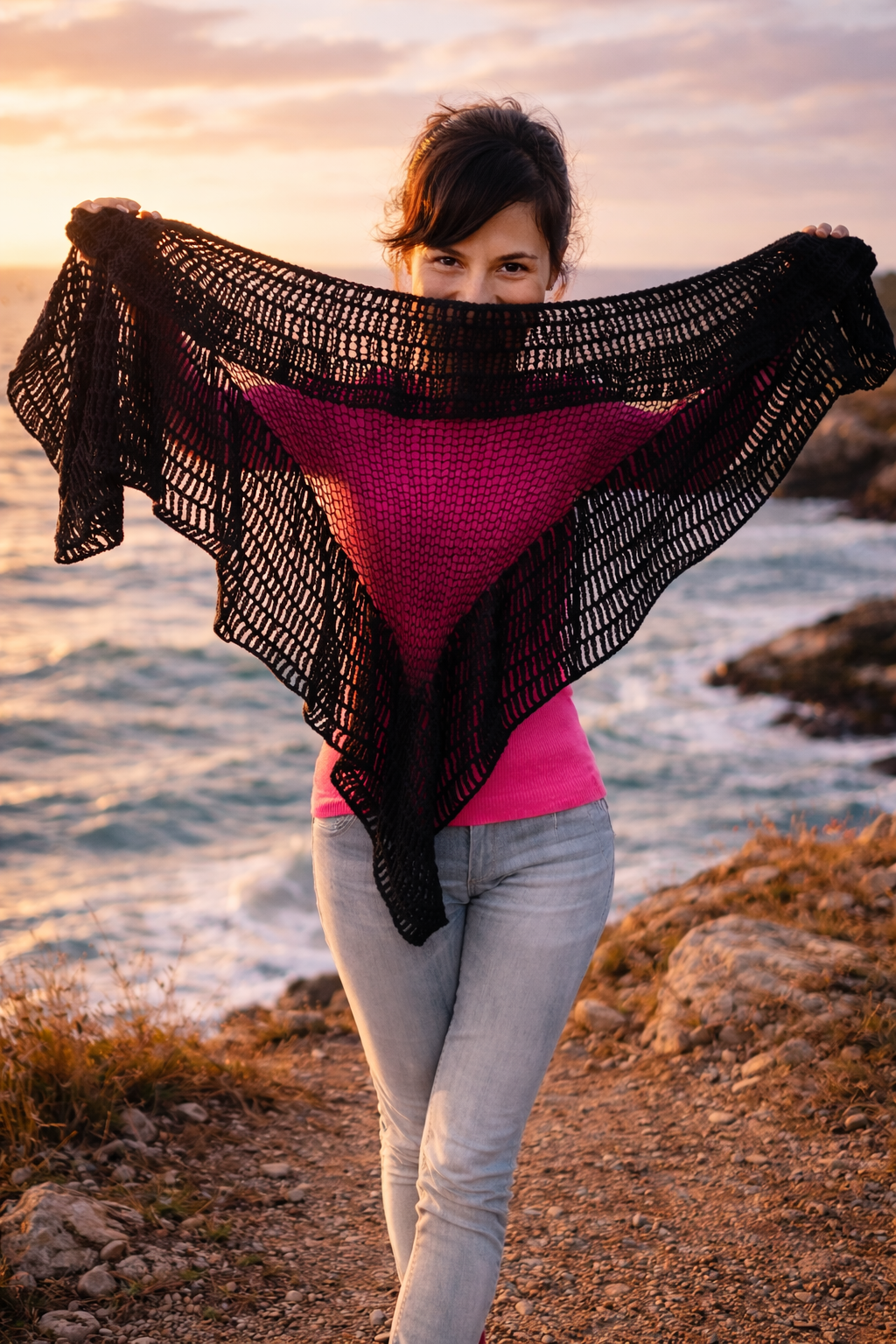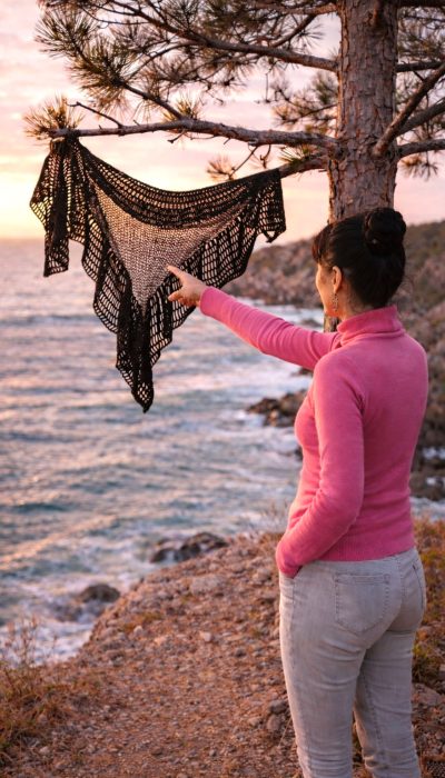Around this airy knitted core runs a wide crocheted lace border, worked in elegant treble crochet stitches. Its flowing, wavy form adds volume and a cloud-like softness, turning the shawl into a garment that is not only cozy and warm but also irresistibly feminine. This dance of knitting and crochet, of net and lace, of lightness and volume, makes the Lorena Shawl a unique accessory — modern in its versatility, timeless in its charm.[:]