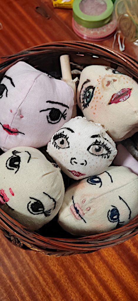 Painting doll faces turned out to be much harder than I expected. At first, I blamed the brushes, then the paint, and even the fabric itself. Maybe the markers weren’t fine enough, maybe the paint didn’t adhere well to the fabric, or maybe—I had to admit—I simply wasn’t skilled at painting. Whatever the reason, the results were… unsettling. Crooked smiles, uneven eyes, strange expressions—I kept trying over and over, but the faces never turned out the way I envisioned.